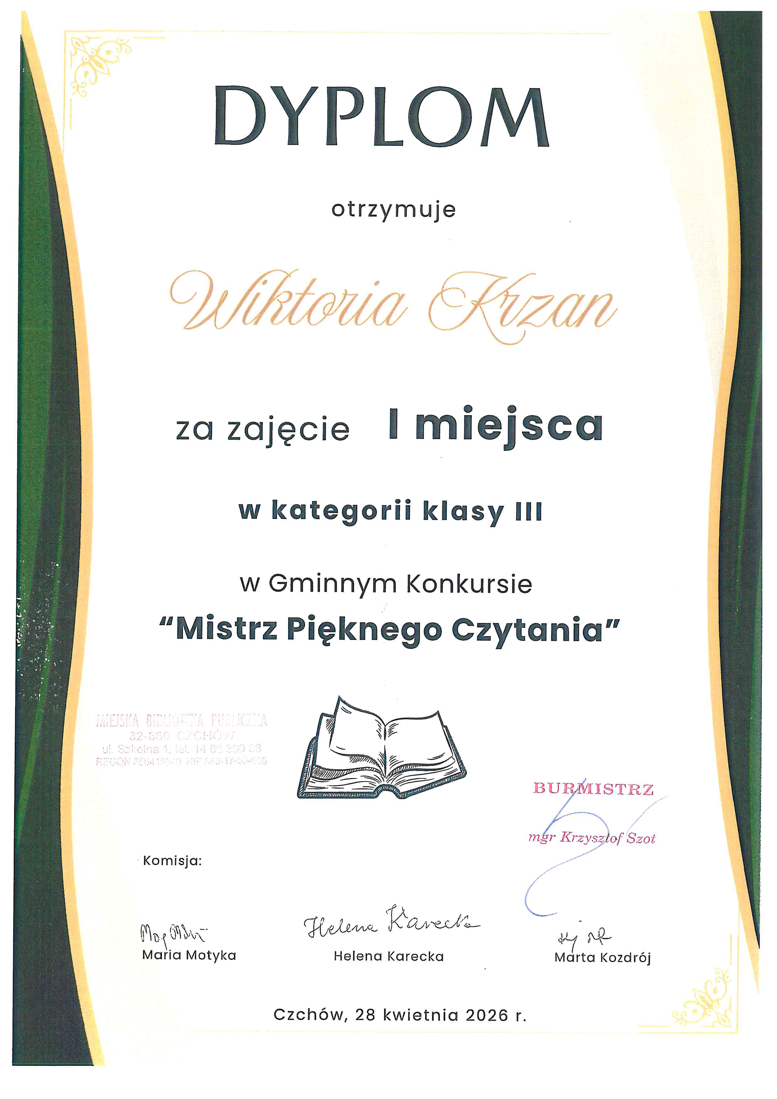 28 kwietnia odbył się gminny etap Konkursu Pięknego Czytania klas 1-3. W konkursie uczestniczyli zwycięzcy szkolnych etapów ze wszystkich szkół w gminie Czchów. Naszą szkołę reprezentowali: