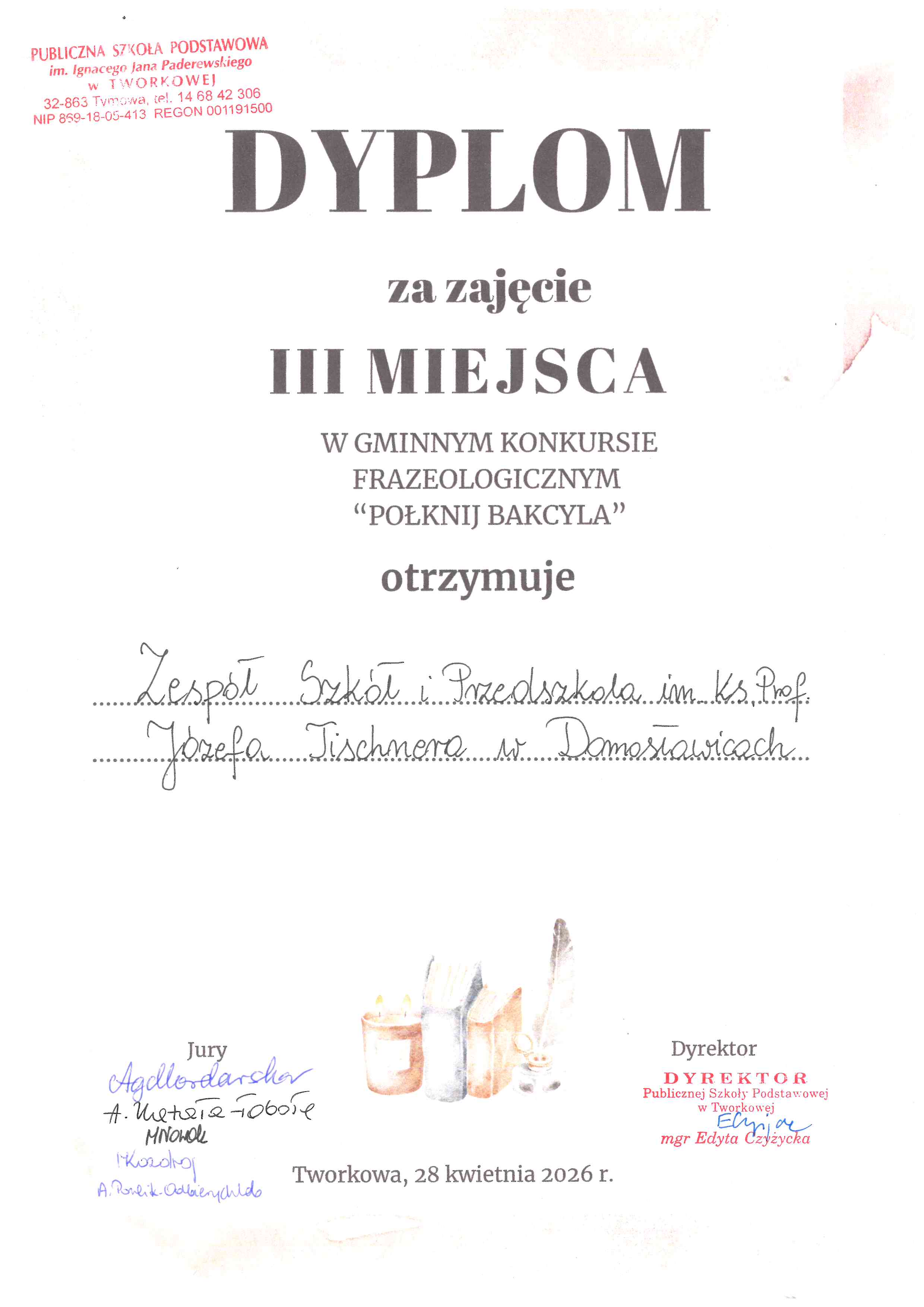 Gratulujemy drużynie z naszej szkoły w składzie: Tymek Piętka, Ola Topolska i Ola Stężowska zajęcia III miejsca w Gminnym Konkursie Frazeologicznym "Połknij bakcyla"- brawo dla Was