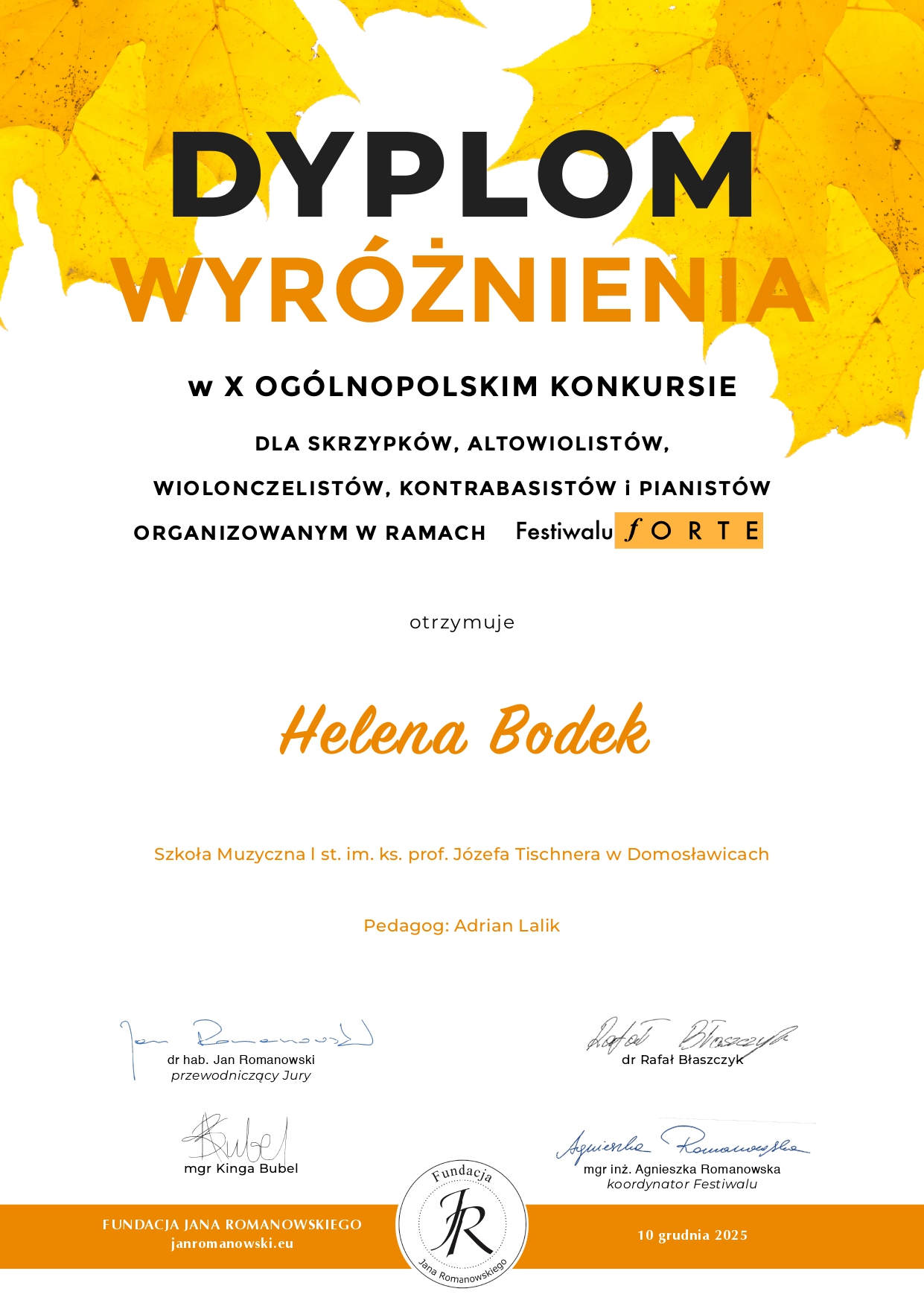 Gratulacje dla Heleny Bodek, uczennicy p. Adriana Lalika zdobycia wyróżnienia w X Ogólnopolskim Konkursie Forte.