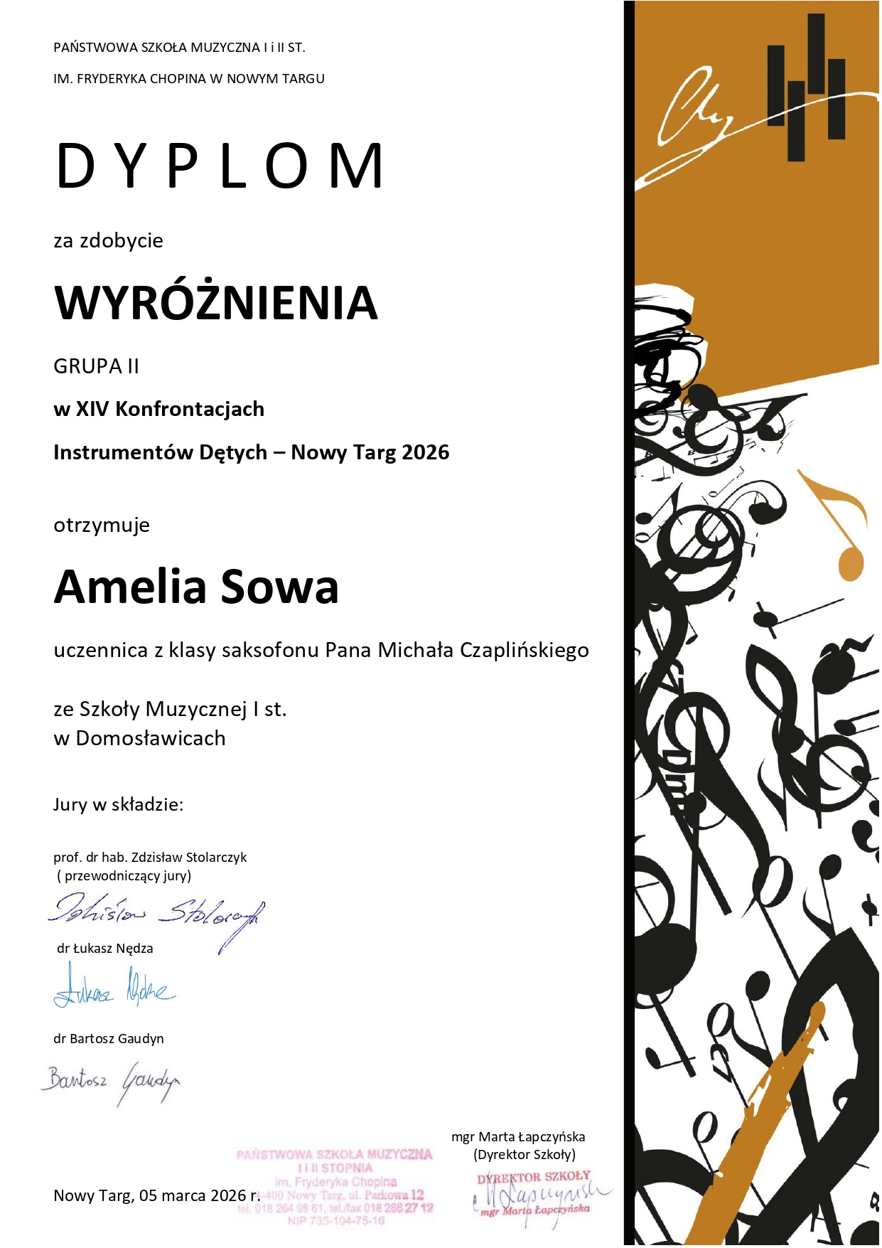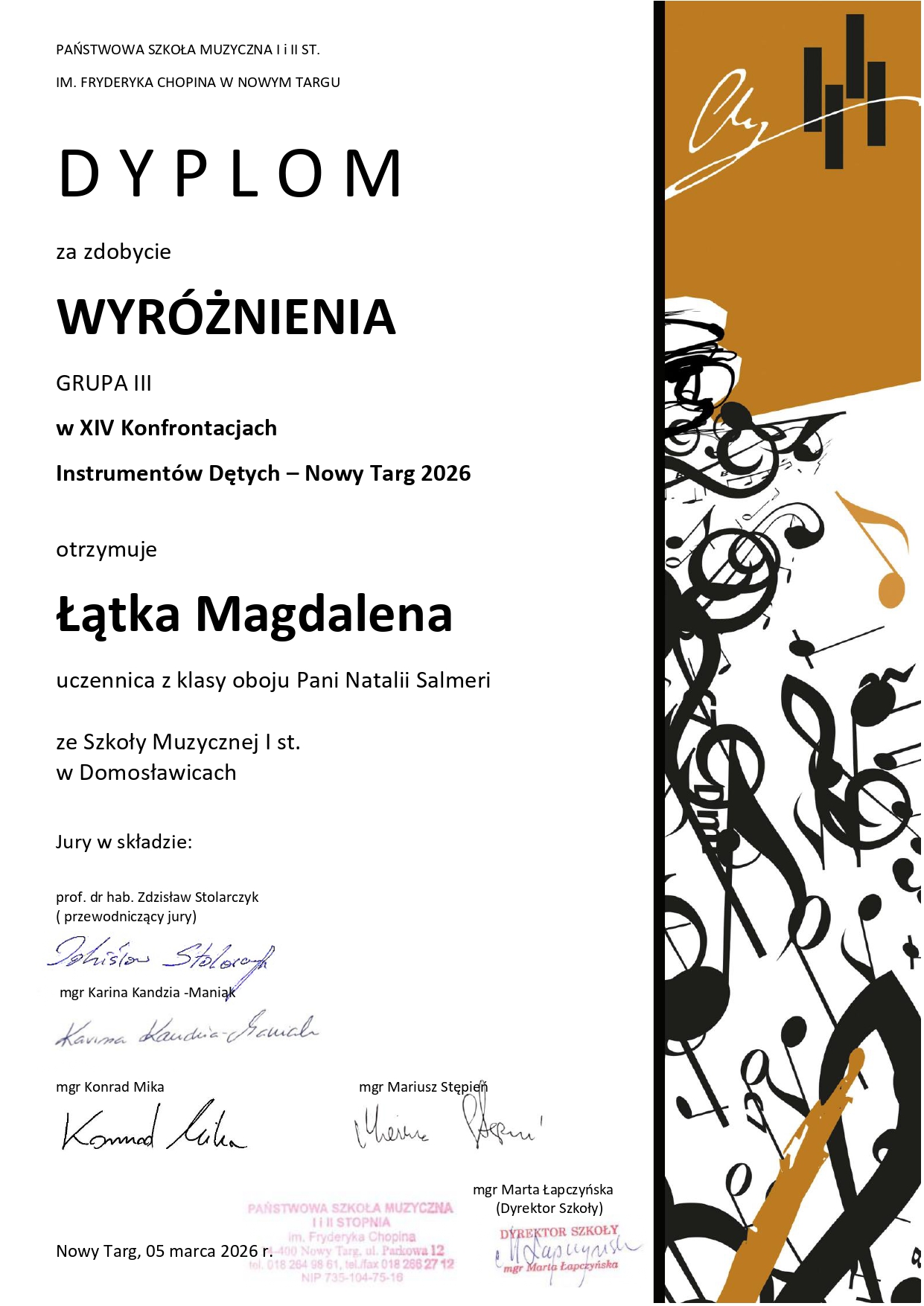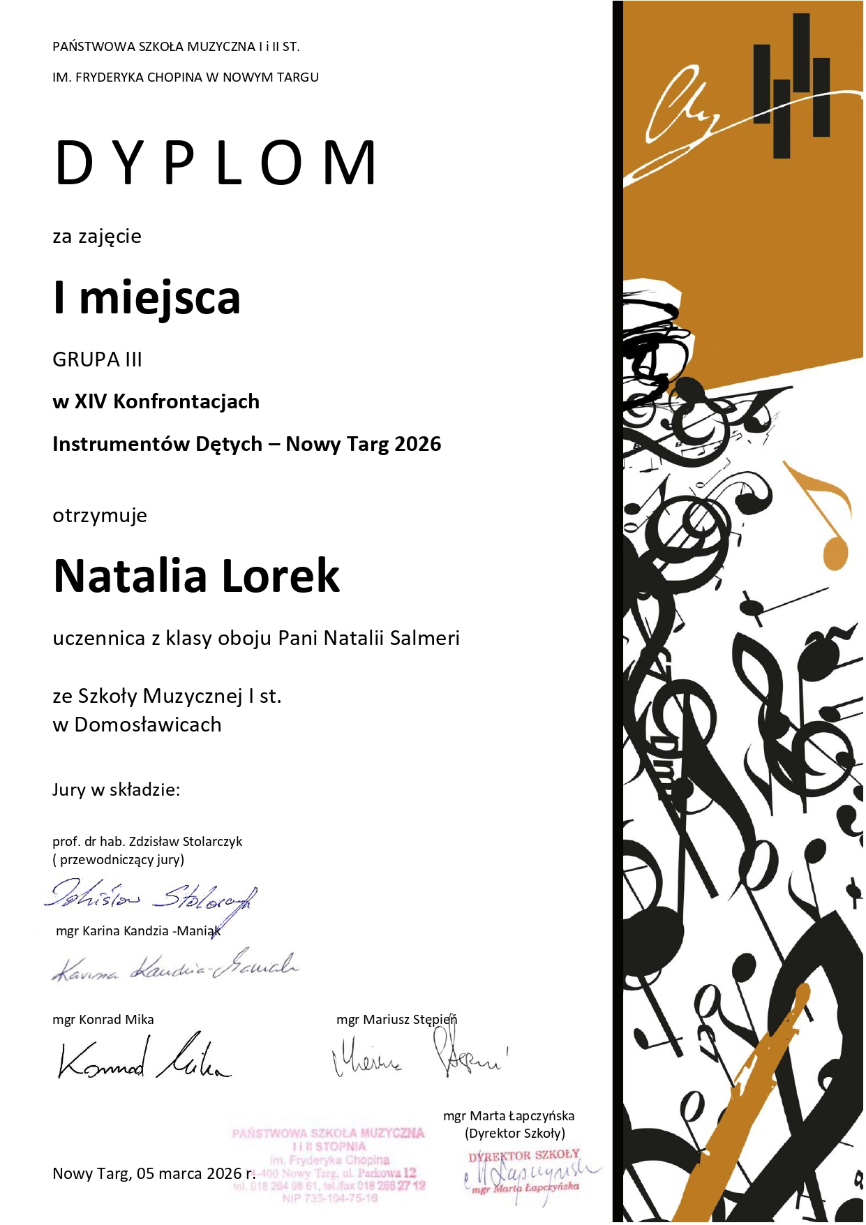 Z dumą pragniemy poinformować, że nasi uczniowie z klasy oboju Pani Natalii Salmeri - Natalia Lorek oraz Magdalena Łątka, trąbki Pana Bartosza Dąbrowskiego - Karol Czubek, oraz saksofonu Pana Michała Czaplińskiego - Amelia Sowa, pięknie reprezentowali szkołę na XIV Konfrontacjach Instrumentów Dętych w Nowym Targu. Powód do dumy jeszcze większy, ponieważ każdy z nich został wysoko oceniony i nagrodzony! Serdecznie gratulujemy Wam drodzy uczniowie ciężkiej i systematycznej pracy, Wam drodzy pedagodzy dziękujemy za przygotowanie i wsparcie do ostatniego kroku "przed wejściem", oraz niezawodnym akompaniatorom Natalii Drozen-Czaplińskiej, Tatianie Yurynets oraz Janowi Baciakowi, .....za to, że dzielili z Wami te emocje na scenie! Życzymy dalszych wspaniałych sukcesów!